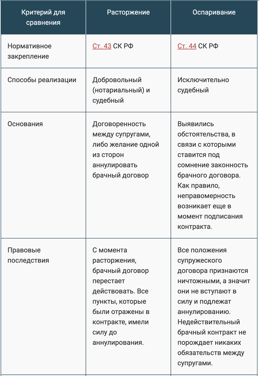 Некоторые ошибочно полагают, что аннулирование и оспаривание брачного договора, это одно и то же. Необходимо знать ключевые отличия, они отражены в таблице ниже.