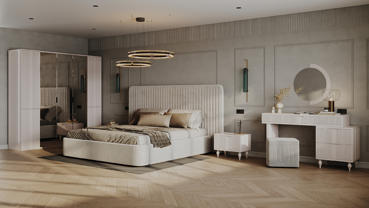 Внутреннее наполнение шкафа продумано до мелочей: полки, выдвижные ящики и специальные секции помогут поддерживать порядок и организованность. Элегантные зеркальные двери визуально увеличивают пространство и добавляют свет в вашу спальню, а стильная фурнитура подчеркивает общий дизайн гарнитура. Каждый элемент этого спального гарнитура продуман.