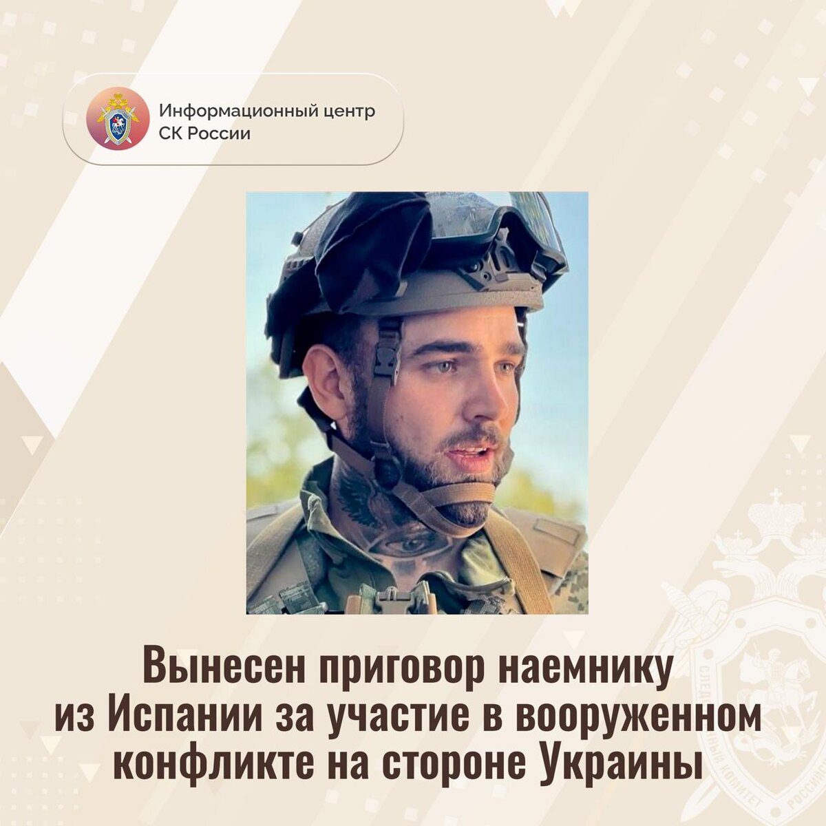 Вынесен приговор наемнику из Испании за участие в вооруженном конфликте на стороне Украины Доказательства, собранные Главным следственным управлением Следственного комитета России, признаны судом достаточными для вынесения приговора в отношении подданного Королевства Испании. Фернандес Пиказо Давид признан виновным в совершении преступления, предусмотренного ч. 3 ст. 359 УК РФ (наемничество). Следствием и судом установлено, что с 2022 года Фернандес в качестве наемника в составе вооруженных формирований Украины участвовал в боевых действиях против представителей силовых структур Донецкой Народной Республики и российских военнослужащих. Перед этим он прошел обучение и получил знания, практические умения и навыки по физической и психологической подготовке, изучил правила обращения с оружием, взрывными устройствами. Его обеспечили личным огнестрельным оружием, боеприпасами, обмундированием и специальным снаряжением военного назначения. Приговором суда Фернандесу заочно назначено н