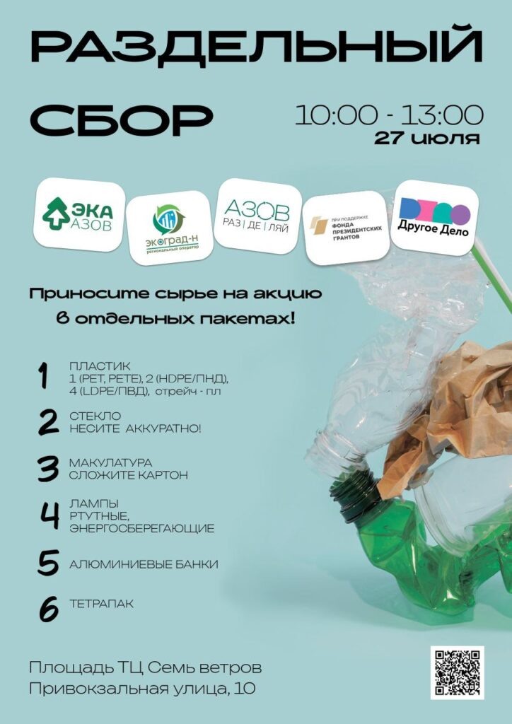 27 июля с 10:00 до 13:00 на площади перед ТЦ «Семь ветров» (м-н «Перекресток») пройдет экологическая акция по раздельному сбору отходов. Организаторы — волонтеры движения «ЭКА» — примут вторсырье для дальнейшей переработки. Что можно сдать: