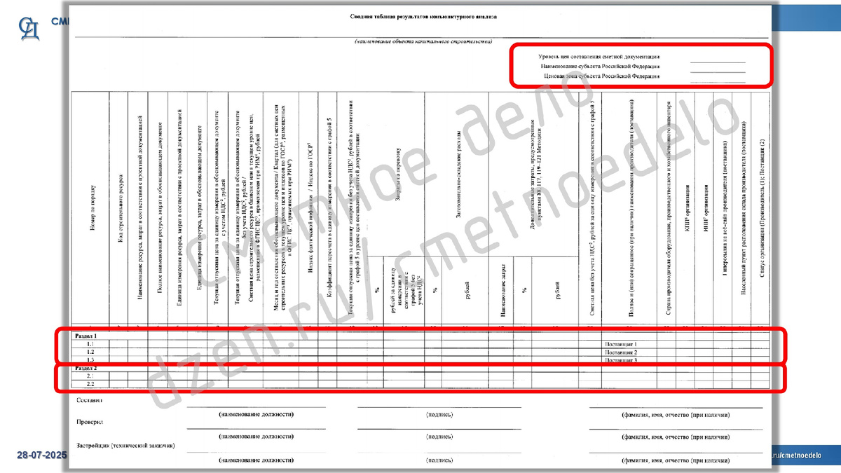 - Новый (?!) конъюнктурный анализ по 421/пр-И3. Часть 2 (от 25.07.2025) Кроме уже рассмотренных нововведений, видоизменилась и непосредственно Сводная таблица результатов конъюнктурного анализа, в которой: 1) Информация об уровне цен составления документации теперь показана не в графах таблицы (исходя из даты обосновывающих документов), а вынесена перед "шапкой" таблицы (не зависит от даты обосновывающих документов); 2) Вместе с уровнем цен составления документации (перед "шапкой" таблицы) дополнительно появилась информация о субъекте Российской Федерации, на территории которого осуществляется строительство; 3) Ресурсы