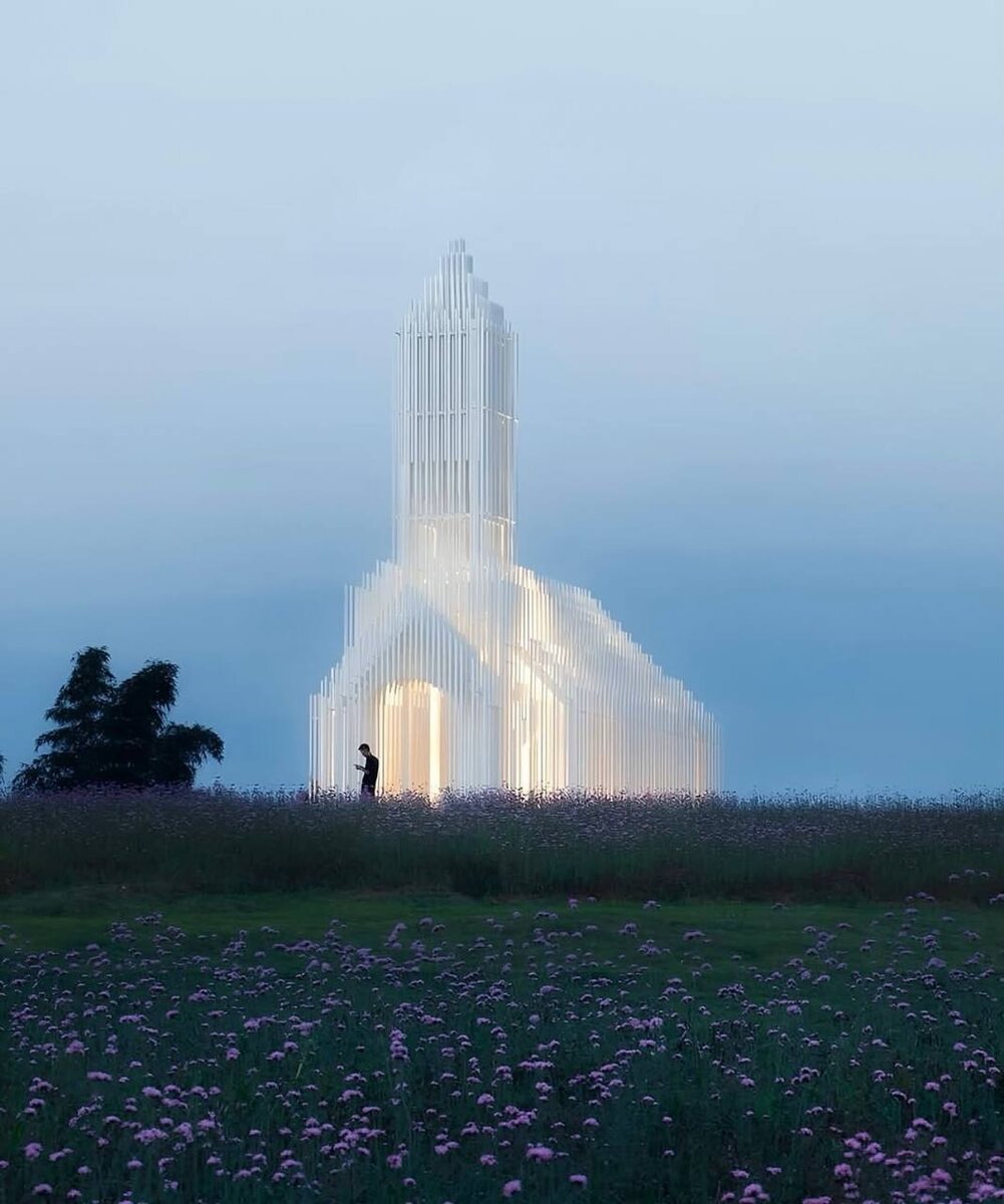 Церковь без теней в Китае или архитектура прозрачности и света В Чэнду, прямо посреди лавандового поля, стоит необычная «церковь без теней». Её спроектировали архитекторы из шанхайского бюро Dachuan Architects, и она сразу привлекает внимание своей легкостью. Вместо привычных стен — ряды тонких алюминиевых стержней. Днём свет свободно проходит сквозь конструкцию, а ночью она мягко подсвечивается изнутри — создавая ощущение, что здание почти растворяется в воздухе. Такое решение — это не просто эксперимент с формой. Оно символизирует открытость, лёгкость и идею духовного пространства без границ. Церковь как место, где можно остановиться, почувствовать спокойствие, тишину и простоту. Эта архитектура не давит — наоборот, она возвращает внимание к самому главному: пространству вокруг и внутреннему состоянию человека. #культура #архитектура #дизайн Звучи в унисон!