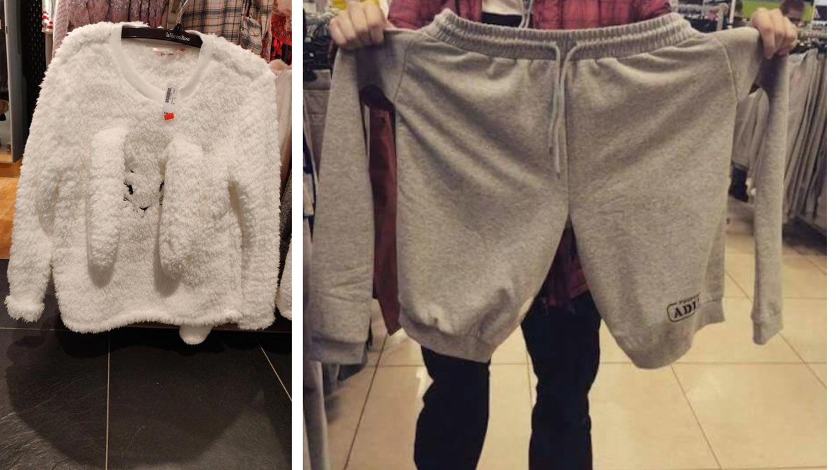 И они думают, мы реально это купим? Нет, но посмеемся обязательно. Сколько же в магазинах странных принтов и фасонов! Не спорим, сейчас очень трудно придумать что-то оригинальное, и многие дизайнеры не хотят изобретать велосипед. Но в попытках перещеголять друг друга заходят слишком далеко. И, кажется, забывают, что вообще-то одежда и обувь делаются для того, чтобы их носить. А мы такое не наденем и бесплатно, даже не предлагайте. Уши торчком и нос кверху? В такой кофте это будет проблематично. Дизайнеры почему-то решили, что и так сойдет, и оставили пушистые ушки висеть в грустном положении. А тут, видимо, что-то перепутали и решили оставить как есть. И так, мол, сойдет. Или творческий полет дизайнеров повел их по кривой дорожке. На мгновение забудем, что подобные принты на легинсах уже давно в прошлом. Нас волнует другое: эти сине-фиолетовые разводы слишком напоминают синяки, и выходить в таком на улицу мы бы никому не рекомендовали. А ведь подобное правда продают и покупают... Вот
