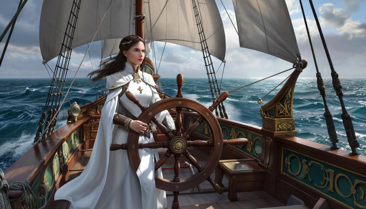 Белый Скиталец, скользя по бесконечным просторам морских волн, продолжал свой путь сквозь бури и шторма. Его корпус скрипел от напряжения, мачты гнулись под тяжестью ветра, а паруса трепетали, словно крылья огромного белого орла. Капитан Арман стоял у штурвала, пристально всматриваясь вдаль, пытаясь разглядеть очертания неизвестных земель или хотя бы намек на то самое богатство, которое искал всю свою жизнь. Вдруг туман впереди начал медленно рассеиваться, открывая взору нечто невероятное: другой корабль, величественный и изящный, плавно скользил навстречу им. На нем развивался белый флаг с изображением красивого перышка, сияющего серебром. — Это она! – воскликнул один из матросов, показывая пальцем вперед. – Корабль капитана Беллы! Арман не сразу поверил своим глазам. Слух о прекрасной Белле уже давно ходил среди моряков. Говорили, что она была обладательницей несметных богатств, имела дар видеть будущее и сердце нежнее самого чистого шелка. Но никто еще не видел ее лично, ведь она