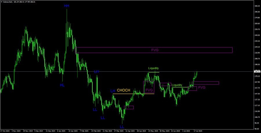 Солана по-прежнему выглядит сейчас наиболее привлекательно для трейдеров. Криптовалюта сохраняет достаточно уверенное восходящее движение, но при этом движется гораздо более технично, чем биткоин или эфир. К примеру, два последних FVG на 4-часовом ТФ были отработаны перед новым витком роста. А каждый «бычий» FVG на восходящем тренде – это возможность для трейдеров открывать длинные позиции, то есть зайти в рынок по тренду в зонах POI. Последняя область FVG была заполнена на 100% перед новым ростом.