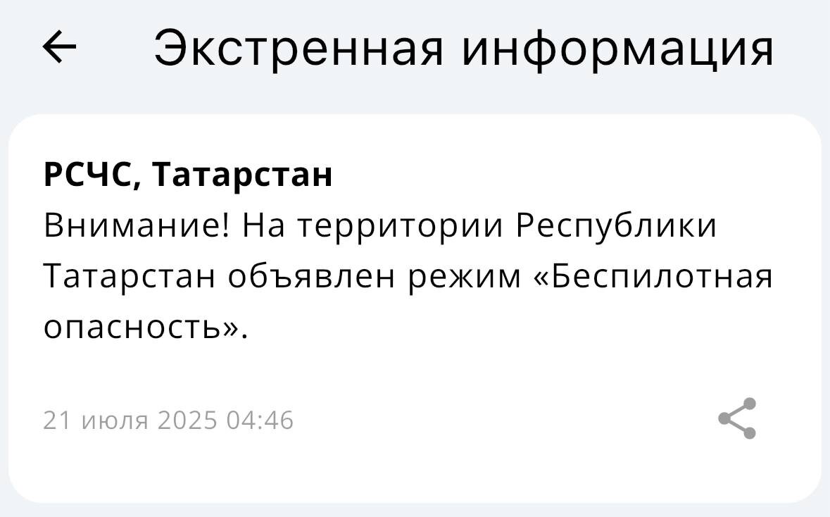 В Татарстане с 4:46 утра объявлен режим беспилотной опасности. 🌟 Tatarstan News