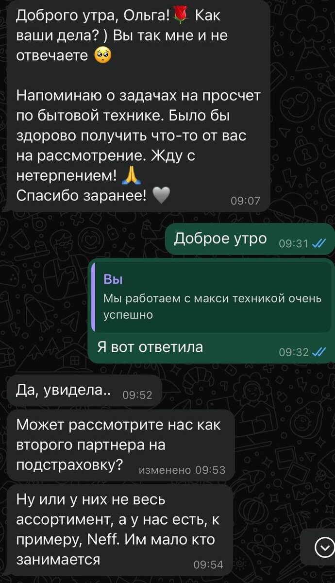 Мы годами выстраиваем партнерские отношения. Win-win - это не просто слова. Это философия, с которой я живу как предприниматель десятки лет. Нас невозможно переманить ценой, в принципе, чтобы мотивировать меня сменить бизнес-партнера, нужно постараться. Мы расстаемся с партнерами: 1. когда не совпадаем по ценностям. Однажды в отказались от сотрудничества, которое приносило стабильные 200-300 тыс в месяц еще в 2017-2018гг. Причиной было отношение партнера-основателя компании, который не решал проблемы с задержкой поставки, а ставил вопрос следующим образом: «ничего страшного, это же двери, не унитаз. Забьют гвоздики, повесят простыни в проемы и поживут так». 2. когда партнер не ценит время и ресурсы: вносит изменения в сотрудничество задним числом или в последний момент, опаздывает или отменяет встречи, проявляет пренебрежение Так в прошлом году мы расстались с партнером, с которым работали 4 года. Потому что не было даже попытки к win-win диалогу 3. Когда они косячат больше трех