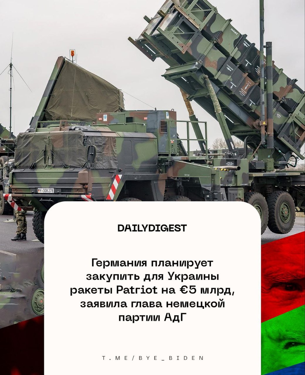 ☑️Главные новости на утро 21 июля: 🔹Германия планирует закупить для Украины ракеты Patriot на €5 млрд, заявила глава немецкой партии АдГ. 🔹Польские ВВС подняли в воздух истребители из-за якобы активности РФ на Украине. 🔹Трамп: команда Washington Commanders должна вернуть историческое имя. 🔹В Румынии сотни людей вышли на антиправительственный протест. 🔹NYT: в больницах США наблюдаются случаи изъятия органов у еще живых пациентов. 🔹Великобритания намерена объявить 50-дневную кампанию по вооружению Украины, сообщила газета The Daily Telegraph. 🔹Digi 24: президент Румынии получил официальное приглашение посетить США. 👍 БайБайден. Подписаться