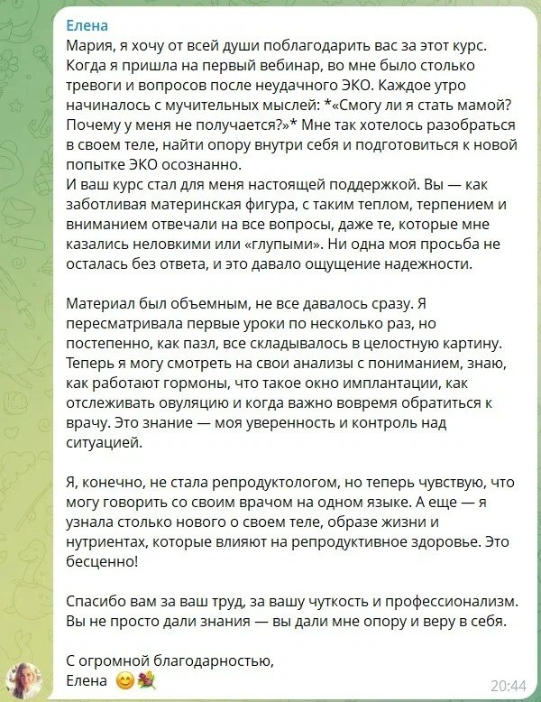 💬 Каждое утро Елены начиналось с мыслей: «Смогу ли я стать мамой? Почему у меня не получается?» Когда она пришла на первый вебинар, в ней было много тревоги. Неудачное ЭКО, страх услышать диагноз, ощущение одиночества. ⠀ Она очень хотела понять своё тело — и подготовиться к новой попытке осознанно. 📍Искала информацию. 📍Искала поддержку. 📍И, главное, — безопасное пространство, где можно быть собой. И нашла круг. «Вы — как заботливая материнская фигура. С таким теплом, вниманием, спокойствием. Ни один мой вопрос не остался без ответа, даже те, которые казались неловкими или глупыми.» Она говорит, что не стала репродуктологом, но теперь уверенно читает свои анализы, знает, как работают гормоны.⠀ А главное — чувствует, что может опираться на себя. Елена прошла путь «от тревоги — к опоре». И её история — напоминание: иногда мягкий круг помогает быстрее, чем десятки поисков «в одиночку». 📩 Старт нового потока — 19 августа. Если вы ищете бережное пространство — присоединяйтесь к бот