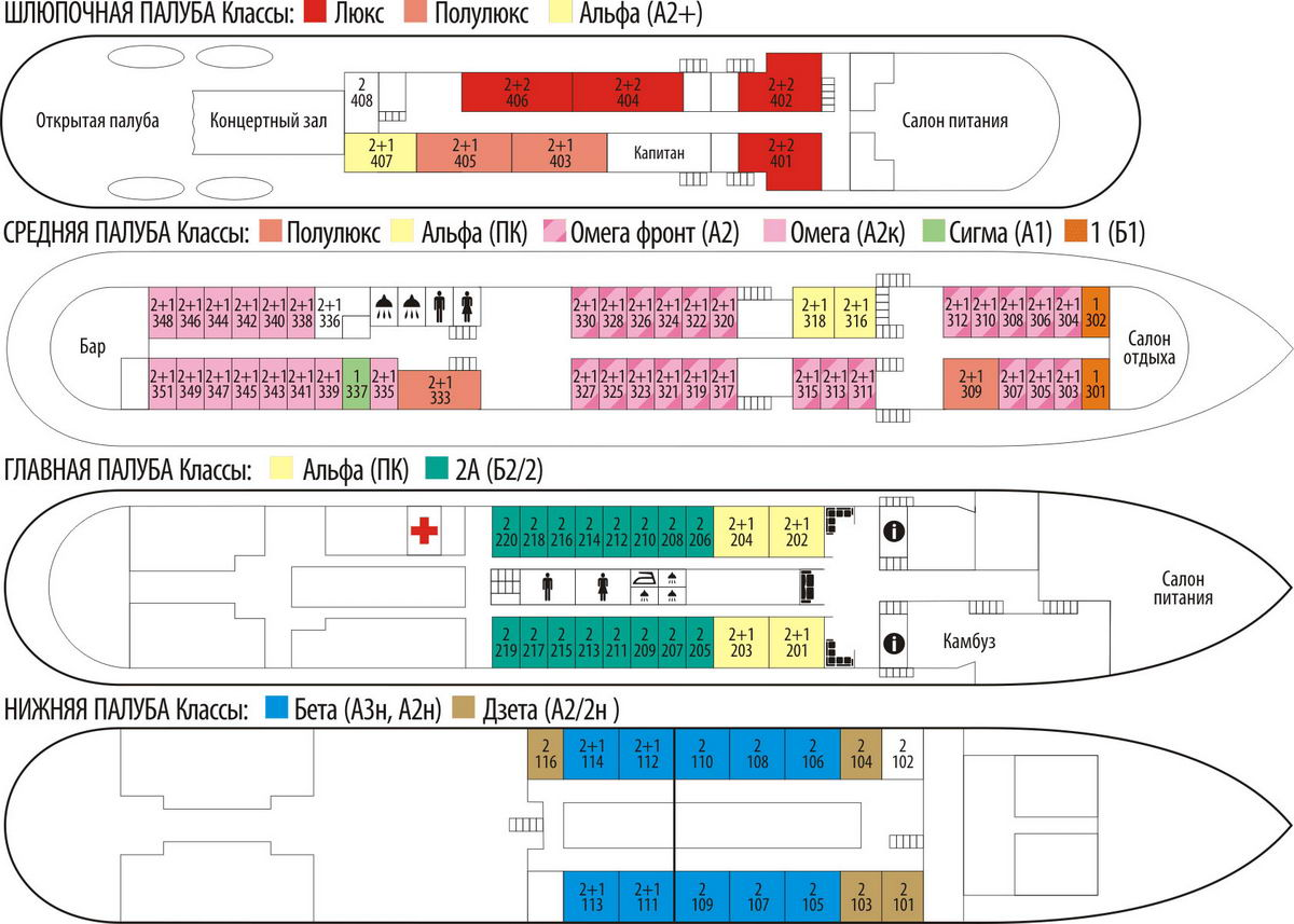 - Дополнительные услуги: Медицинский пункт, гладильная комната, сувенирный киоск и кулеры с горячей и холодной водой на каждой палубе.