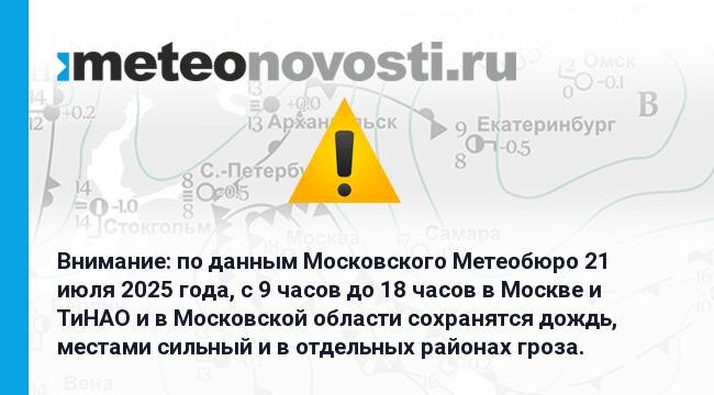 Внимание: по данным Московского Метеобюро 21 июля 2025 года, с 9 часов до 18 часов в Москве и ТиНАО и в Московской области сохранятся дождь, местами сильный и в отдельных районах гроза. Перейти на сайт Прогноз погоды на 14 дней