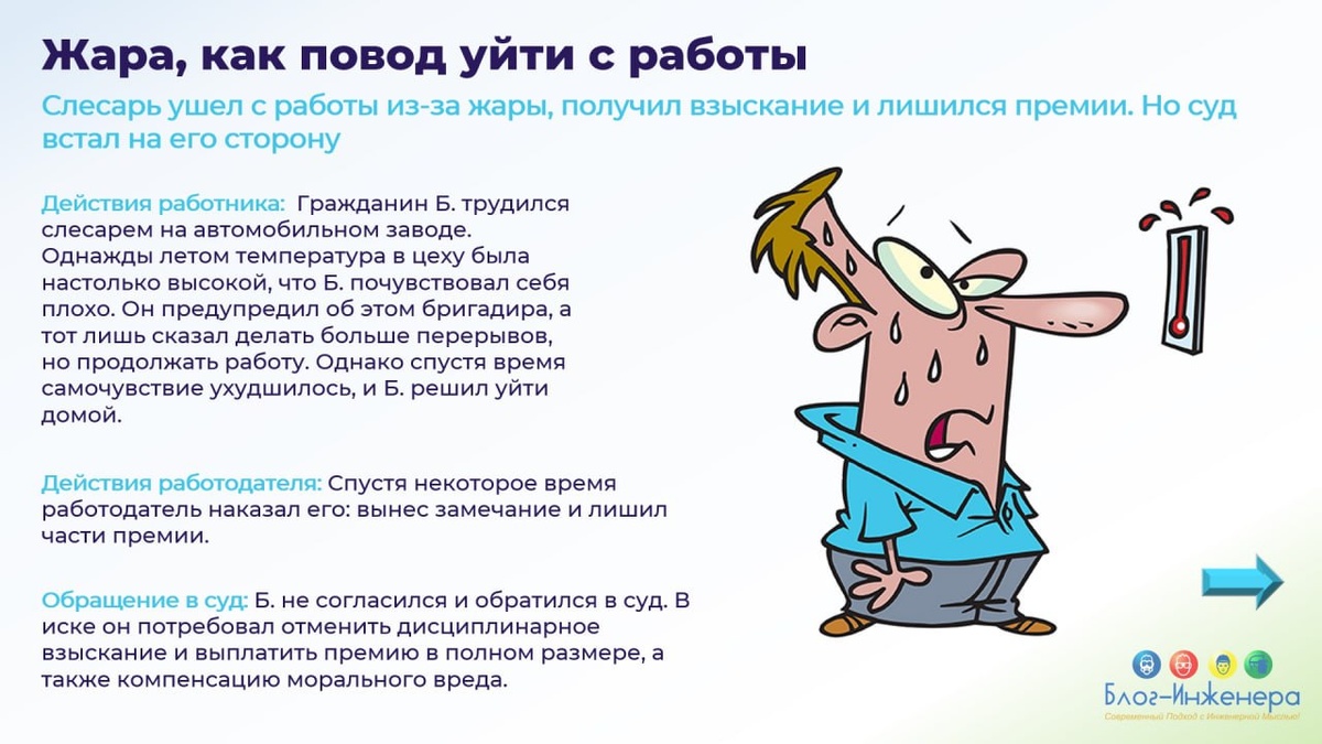 ⬆️ В карточках мы представили свежее дело, где суд проверил, правомерно ли наказывать сотрудника за отказ работать в невыносимую жару. Напомним, в большой статье мы разобрались, как организовать работу в жару и объяснили: ✅ что такое терморегуляция и как она работает. ✅ какие риски существуют при работе в жару. ✅ нормативное регулирование работы в жару. ✅ какие меры применить для снижения профессиональных рисков для работающих в жару. Хотите правильно организовать работу в жару, тогда вы идёте читать ➡️ http://bif.one/LMnycZ2 Блог—Инженера для тебя ❤️ ⭐️ СУОТ 📍 Услуги