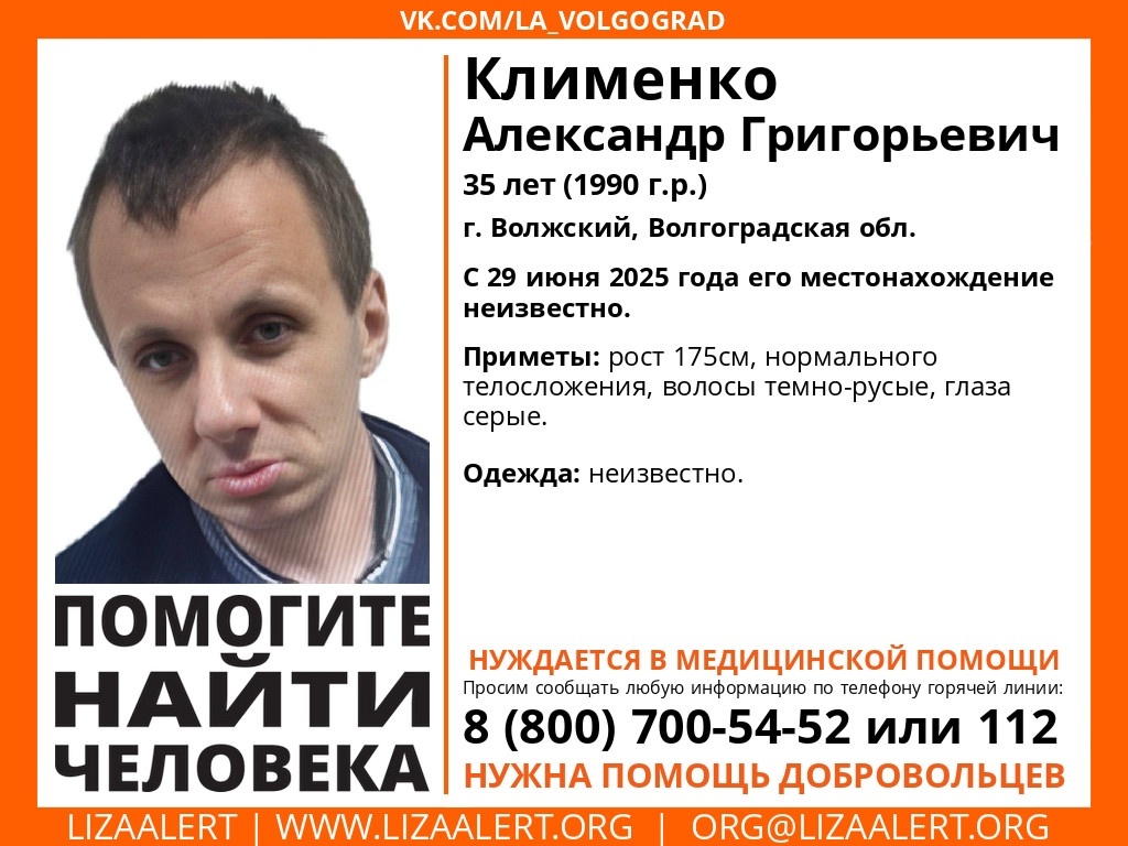 В Волжском пропал без вести 35-летний Александр Клименко. Также в городе были объявлены поиски 37-летнего Ильяса Аронова. Об этом сообщает отряд «Лиза Алерт». О местонахождении Александра не известно с 29 июня. В какой одежде был молодой мужчина, также нет информации. Он достаточно высокий, нормального телосложения, у Александра темно-русые волосы и серые глаза. Мужчина нуждается в медицинской помощи. Ранее стало известно об исчезновении другого жителя Волжского — Ильяса Аронова, который пропал более месяца назад. Последний раз 37-летнего мужчину видели 16 июня 2025 года, его местонахождение остается неизвестным.
