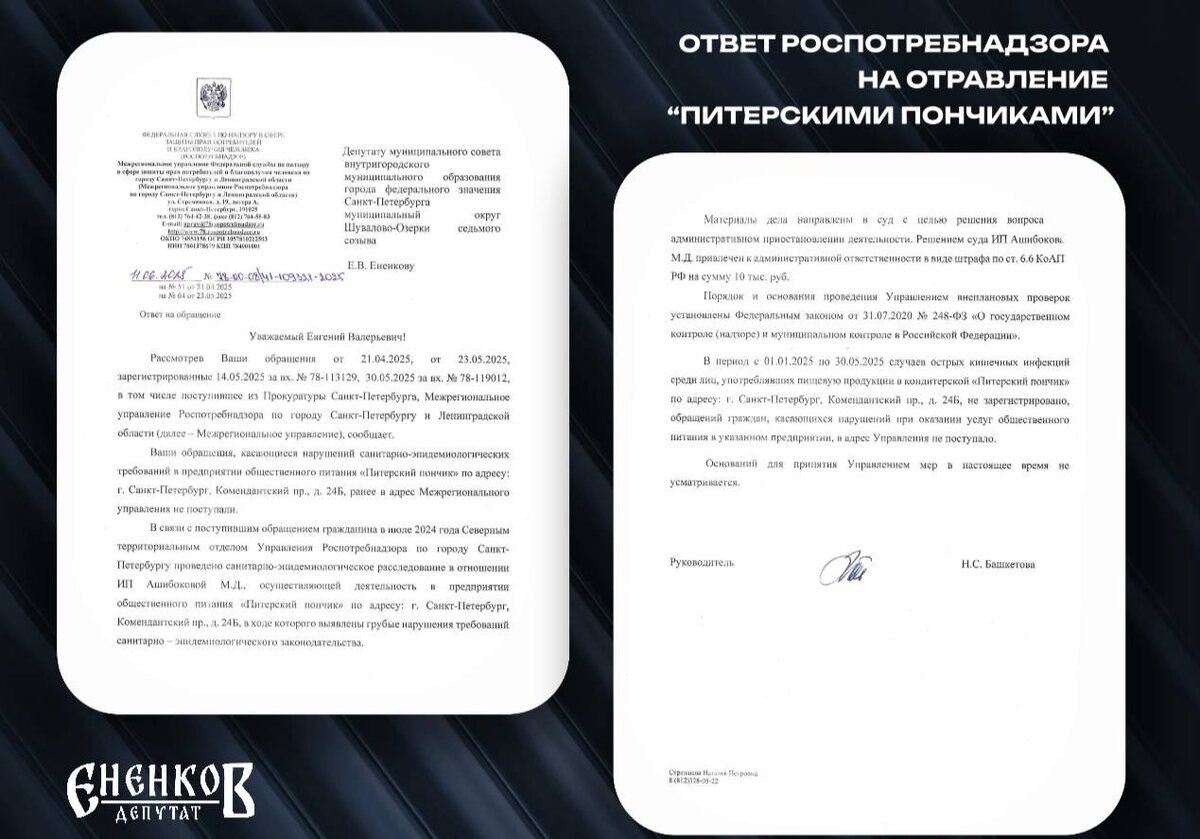 Пончик не прошёл проверку Роспотребнадзор завершил проверку по моим обращениям в отношении заведения «Питерский пончик» на Комендантском проспекте. Ещё в июне я провёл рейд после жалоб на массовые отравления. Тогда лично зафиксировал грубые нарушения: разгрузка без спецодежды, доступ посторонних в производственную зону, полное игнорирование санитарных норм. Сейчас по итогам проверки выявлены серьёзные нарушения санитарного законодательства, владелица заведения - ИП Ашибокова привлечена к административной ответственности и оштрафована по ст. 6.6 КоАП РФ, жаль, что всего на 10 тысяч рублей. Спасибо тем, кто привлек внимание к проблеме. В сфере общепита должен быть порядок, особенно в заведениях рядом со школами. #ЕНЕНКОВ #ЛДПР