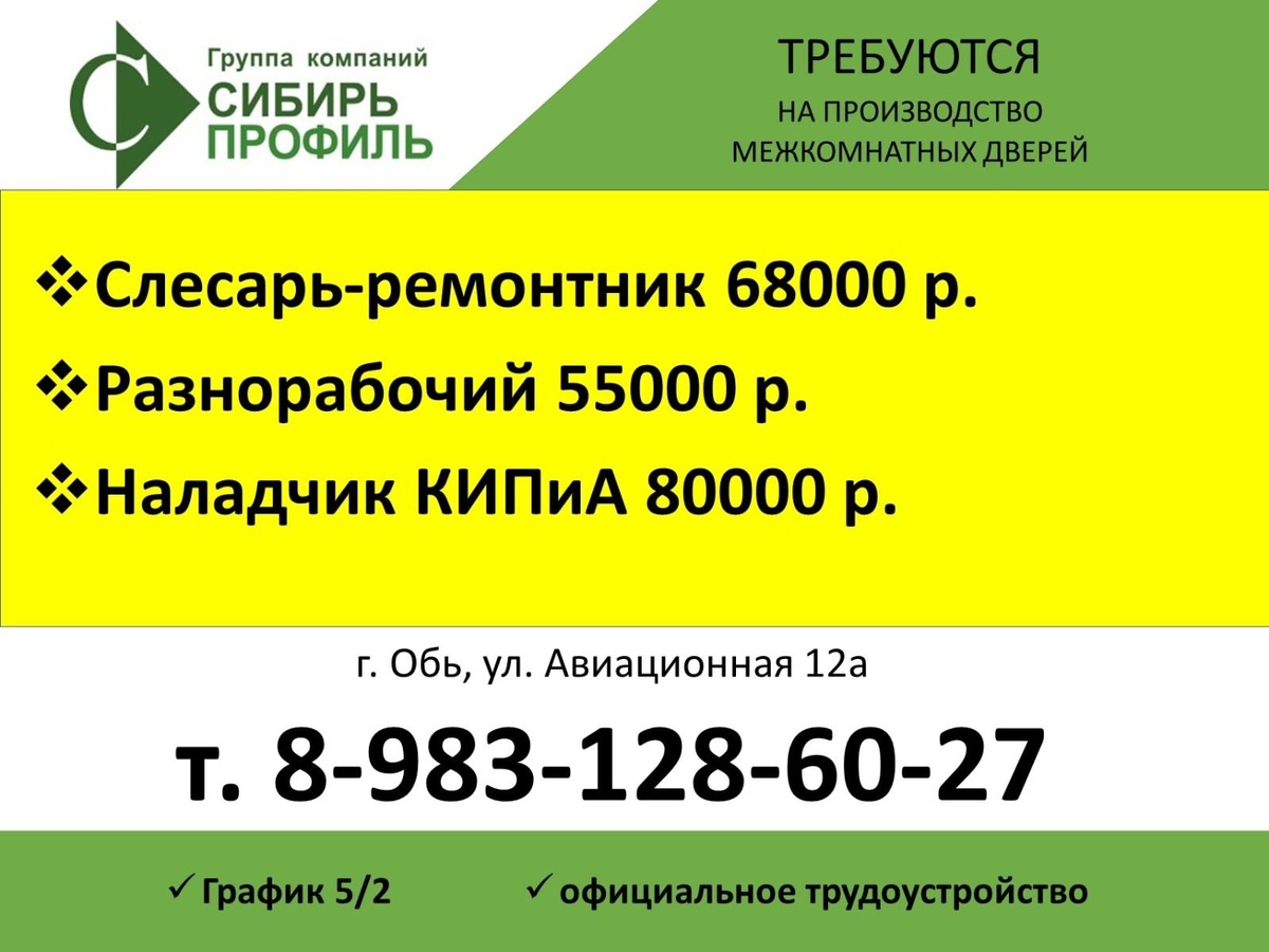 На производство МЕЖКОМНАТНЫХ дверей требуются: ✅Слесарь-ремонтник 68тр. ✅Разнорабочий 55тр. ✅Наладчик КИПиА 80 тр. 8-983-128-60-27 отдел персонала. г. Обь, ул. Авиационная 12а. #Reklama@ob.gorod http://vk.com/ob.gorod?w=wall-100380192_529654