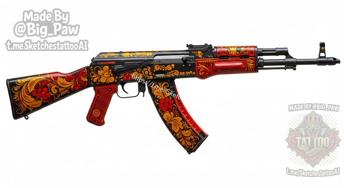 #2616 Подборка по запросу подписчика - Автомат под хохлому 🧠 SYNTX 💳 Донат 😎 НейроБро 😎 Эскизы без вотера 💀 Эскизы от нейросети #милитари #оружие #хохлома #эскиз #тату #татуировка