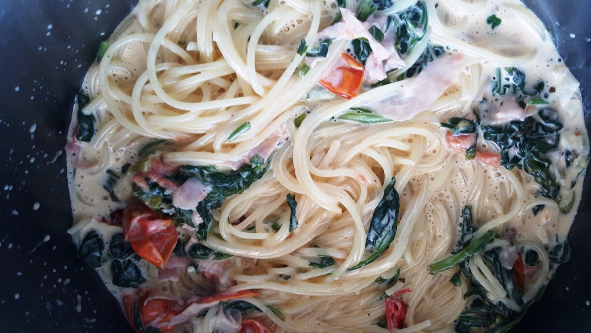 ▌ Ингредиенты: - Макароны (например, спагетти или феттуччине) — 300 г - Шпинат свежий — 200 г - Томатная паста — 2 ст.л. - Сливки жирные (не менее 20%) — 200 мл - Чеснок — 2 зубчика - Оливковое масло — 2 ст.л. - Сыр пармезан — 50 г - Соль, перец черный молотый — по вкусу - Свежий базилик (для украшения) ▌ Инструкции: 1. Подготовка ингредиентов: - Нарубите чеснок мелкими кубиками. - Промойте шпинат и обсушите бумажным полотенцем. - Натрите сыр пармезан на мелкой терке. 2. Приготовление пасты: - Доведите большую кастрюлю воды до кипения, добавьте щепотку соли и варите макароны согласно инструкции на упаковке до состояния аль денте. 3. Обжаривание чеснока и шпината: - Разогрейте оливковое масло в глубокой сковороде или сотейнике. - Добавьте измельченный чеснок и обжарьте около минуты, пока он не станет ароматным и слегка золотистым. - Затем положите свежий шпинат и тушите примерно две-три минуты, пока листья не станут мягкими и уменьшатся в объеме. 4. Создание сливочного соуса: - Смешайте