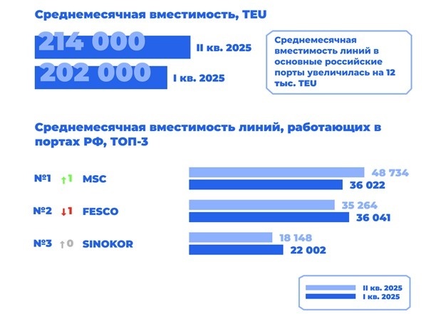 Команда SeaLogic проанализировала рынок морских контейнерных перевозок в России за апрель-июнь 2025 года. В этот период в российских портах работали 33 отечественных и зарубежных судоходных оператора. Лидером рейтинга стала международная компания MSC со среднемесячной вместимостью 48 734 TEU (22,8% рынка). FESCO, возглавлявшая рейтинг в I квартале, опустилась на второе место с показателем 35 264 TEU (16,5%). Третью позицию сохранила корейская SINOKOR (18 148 TEU, 8,5%). Значительный рост продемонстрировали ЕВРОСИБ, поднявшаяся с 18-го на 11-е место благодаря расширению флота (4 787 TEU, 2,2%), и TORGMOLL, переместившаяся с 15-го на 7-е место (7 041 TEU, 3,3%). В рейтинг вошли новые дальневосточные операторы FAST SHIPPING LINE и SMART SHIPPING LINE. Компания TFL Logistic прекратила регулярные рейсы в российские порты. Эксперты ЕВРОСИБ отметили сокращение общей вместимости флота на Дальнем Востоке из-за снижения импортных отгрузок из Китая, а также консолидацию рынка на фоне ухода мелких