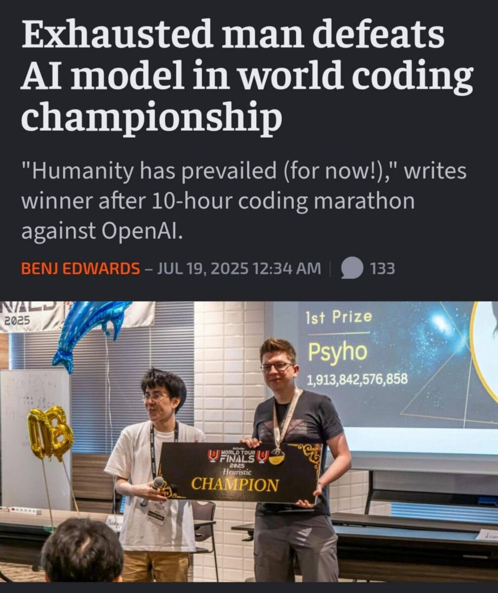 Человек победил нейросеть в соревнованиях по кодингу в Токио. Программист из Польши соревновался со специально созданной моделью от OpenAI в 10-часовом состязании. Бойцы имели одинаковое оборудование и соблюдали одинаковые правила по языкам программирования и времени отправки решений. Парень показал результат почти на 10% лучше, чем ИИ — его лично поздравил Сэм Альтман.