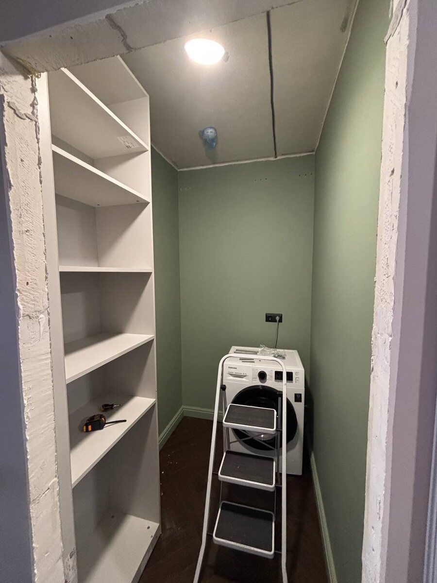 Успешно реализован компактный проект гардеробной-прачечной Площадь помещения всего 2,5 кв.м была эффективно использована для создания многофункционального пространства. Продуманная система хранения включает в себя: - Вместительные полки для одежды - Функциональные выкатные ящики - Удобные штанги для вешалок - Специальную полку над стиральной машиной Особое решение — конструкция над стиральной машиной, которая служит не только полкой для хранения, но и основанием для выкатной гладильной доски. Это позволяет максимально оптимизировать пространство и избежать лишних предметов в помещении. Грамотное планирование и современный подход к организации пространства позволили создать удобное и функциональное помещение, где каждый сантиметр работает на комфорт пользователей.