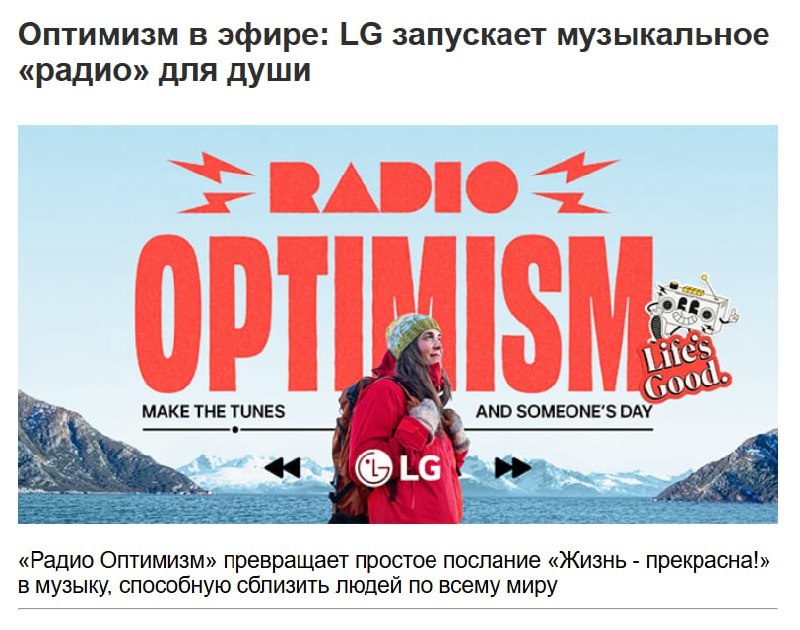 Гениальную штуку придумали маркетологи южнокорейского технологического гиганта: Они, по сути, "пересобрали" радио в том виде, в каком оно задумывалось - любимые песни для любимых людей, передача добрых пожеланий через сотни километров, позитив и эмоциональная связь с близкими. Причём сделали это с помощью простых форм управления искусственным интеллектом. Компания LG Electronics запустила глобальный проект «Радио Оптимизм», чтобы напомнить: технологии должны не отдалять, а объединять. И сделать это с помощью самого универсального языка — музыки. Вдохновлённая магией классического радио, новая кампания превращает эмоции в песни, которые можно дарить близким. На интерактивной платформе любой человек может сгенерировать персональную музыкальную композицию с помощью искусственного интеллекта — достаточно ввести текст, и AI создаст мелодию, а также обложку, как у настоящего альбома. Получившуюся песню можно отправить любимому человеку в качестве тёплого цифрового подарка. А если пожелает