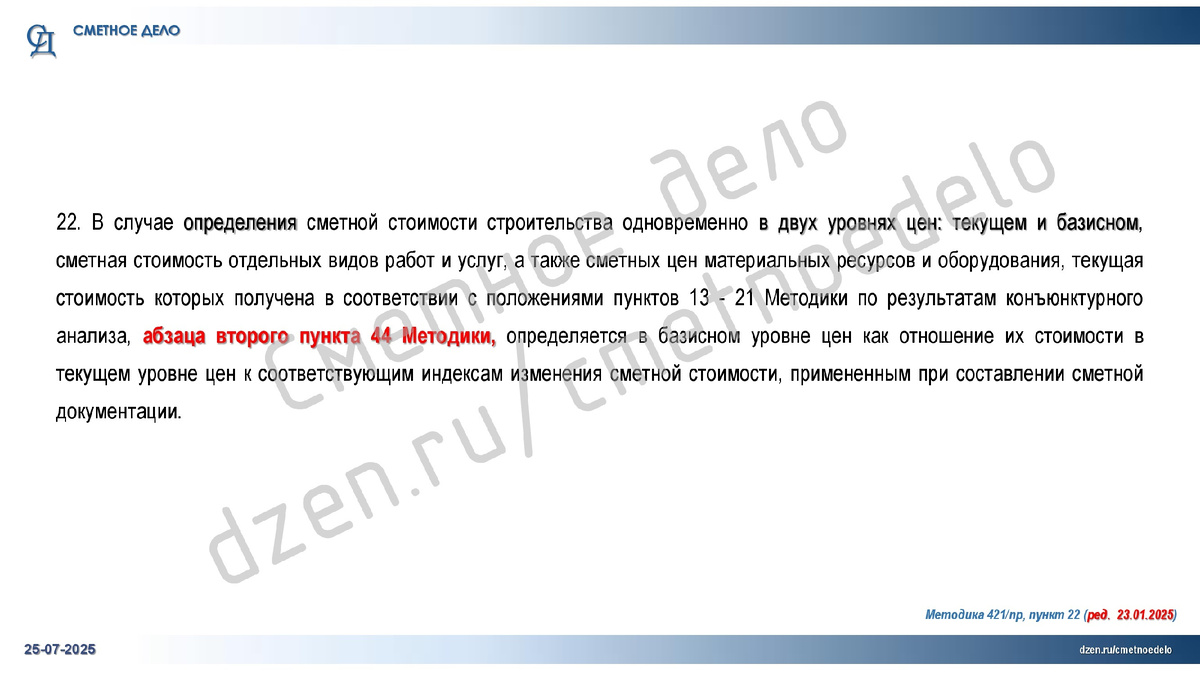 Приказом Минстроя России от 23.01.2025 № 30/пр внесено третье изменение в Методику определения сметной стоимости строительства (приказ Минстроя России от 04.08.2020 № 421/пр), в том числе в части конъюнктурного анализа. ▶️▶️ Указанные изменения помимо общих правил к обосновывающим документам в части производителей и поставщиков, затронули перечень ресурсов, подлежащих конъюнктурному анализу. В частности, при работе базисно-индексным методом конъюнктурному анализу подлежат ресурсы отсутствующие в двух сметно-нормативных базах - ФССЦ-2001 (ФСНБ-2020) и ФСБЦ-2022 (ФСНБ-2022): Подробно о нововведениях в соответствии со вторым абзацем пункта 44 Методики 421/пр изложено в статье "Изменение условий работы БИМ" от 17.03.2025 г. ▶️▶️ Кроме того, третье изменение в Методику 421/пр затронуло и правила кодировки ресурсов по конъюнктурному анализу. Если правила кодировки в Методике 421/пр-И2 звучали следующим образом: В Методике 421/пр-И3 в третьей группе цифр появилось разъяснение о том, как прави