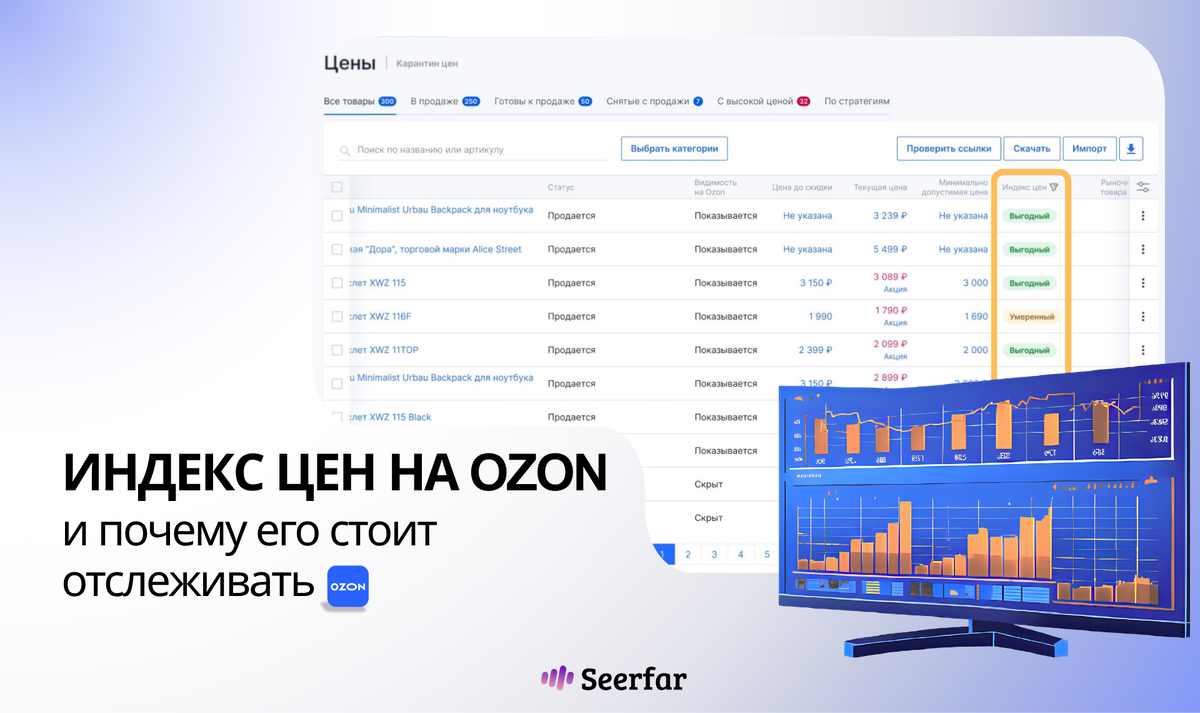 Индекс цен - показатель, рассчитываемый маркетплейсом как рекомендация для корректировки цен и поддержания их на рыночном уровне. Показатель рассчитывается с учетом ваших цен на товары, в том числе на других маркетплейсах, цен конкурентов, региона доступности товара, рейтинга и отзывов. В зависимости от расчетного показателя, товарам присваиваются следующие индексы: Вы можете найти Индекс цен для ваших товаров в личном кабинете продавца во вкладке Цены и акции -> Цены на товары. В таблице с параметрами будут отображаться как итоговый индекс для каждого товара, так и основания для его расчета, включая цены ваших конкурентов на Ozon и на других площадках, а также ваши цены на других площадках. 》》Несколько дней назад появилась возможность самостоятельно предлагать товары конкурентов на Ozon для сравнения стоимости с вашими товарами и расчета индекса цен. Это можно сделать в том же разделе в личном кабинете Цены и акции -> Цены на товары или блоке Индекс цен во вкладке Главная. Если ссыло