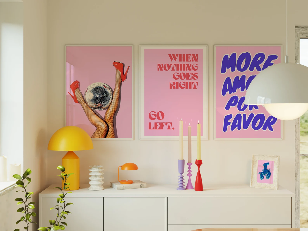 Не бойтесь крупных размеров. Чем больше размер, тем выразительнее акцент. Для игры с масштабами хорошо подойдут схожие элементы разного размера. Например, несколько постеров с красными деталями, которые создают цветовой ритм в интерьере.