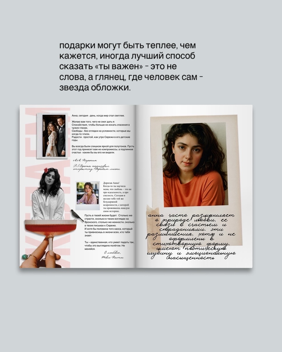 Представьте себе Анну Каренину в наше время. Не героиню трагического романа, а живую женщину - современную, уставшую, красивую, сложную. Она не на перроне, а где-то между терапией, детьми, работой и внутренними сомнениями. И вот её подруга, Долли Облонская, хочет поддержать её. Но не словами, не советами и не ужином. Она заказывает для неё… журнал. Настоящий. Как глянец, только не про звёзд, а про Анну. Что это за журнал? Идея родилась у меня спонтанно - после подкаста, где обсуждали, как важно видеть свою ценность глазами других людей. И я подумала: а если бы мы могли подарить человеку не просто открытку или пост в соцсетях, а настоящий журнал - оформленный, красивый, тёплый. Где собраны его истории, фото, фразы, воспоминания, реакции близких. Где он - главный герой. Я решила попробовать - и собрала первые страницы такого журнала от имени Долли Облонской для Анны Карениной. Создала фото с помощью нейросетей (Remini, GPT), написала тексты от друзей, придумала рубрики. Получился