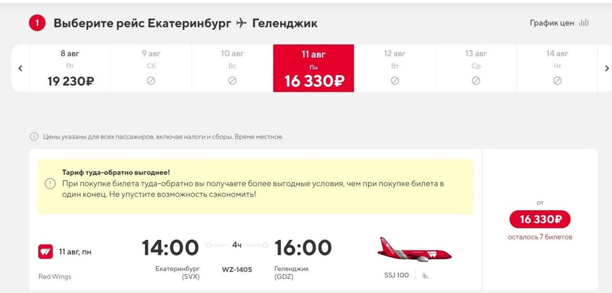 ➡️Из Екатеринбурга рейсы Red Wings в Геленджик начнутся с 8 августа. Запланировано две частоты в неделю (по понедельникам и пятницам). Билеты – от 16,3 тыс. рублей в одну сторону (без багажа), в обе стороны с багажом – от 41,9 тыс. рублей.