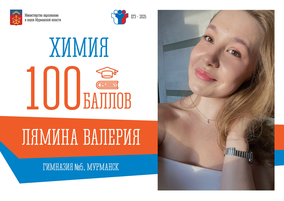 Выпускница класса естественно-научного профиля мурманской гимназии № 5 Валерия Лямина безупречно выполнила экзаменационную работу по химии и заслуженно получила высший балл. Радость была огромной, как и благодарность Ирине Большаковой, учителю, который, по мнению выпускницы, «сочетает в себе строгость и безмерную любовь к своим ученикам, отлично знает свой предмет. Это пример для подражания для многих учеников!». Химия - первый экзамен. Результат окрылил, вселил уверенность в то, что и дальше все пойдет хорошо. Валерия любимыми предметами считает алгебру и химию, но и второй профильный предмет, биологию, сдала на 100 баллов. 200 баллов! Такого результата в регионе не было с 2021 года. Но для девушки это не первая победа. В 2024/2025 учебном году она стала победительницей регионального этапа ХI Межрегионального химического турнира. Школу окончила с золотой медалью и планирует стать кардиохирургом.