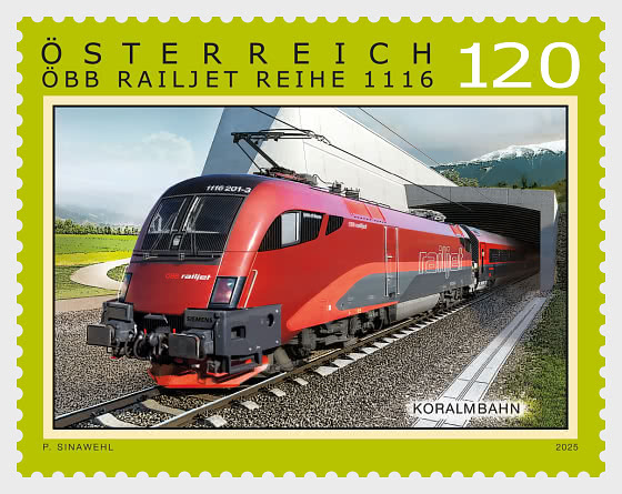 Этот проект имеет не только надрегиональное значение – он также призван оживить экономику юго-восточного региона Австрии. До сих пор самое быстрое железнодорожное сообщение между столицами федеральных земель Грацем и Клагенфуртом занимало около трёх часов. С появлением железной дороги Коралм, рассчитанной на скорость до 250 км/ч, это время в пути сократится примерно до 45 минут. Строительство железной дороги Коралм началось в 1998 году. Общая протяжённость маршрута составляет 130 километров, и он включает в себя множество мостов, подземных переходов и туннелей. Его центральным элементом является 33-километровый туннель Коралм, состоящий из двух однопутных труб и входящий в число самых длинных железнодорожных туннелей в мире. Начало пассажирских перевозок по всей линии запланировано на конец 2025 года. На марке изображен туннель Коралм с локомотивом ÖBB Railjet серии 1116.