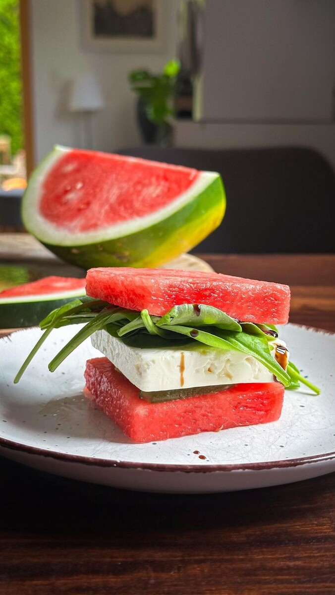 Арбуз — это большая сладкая ягода с зелёной кожурой и сочной мякотью, которая может быть красной, розовой или жёлтой. Внутри находятся многочисленные семена. Арбузы ценятся за освежающий вкус и часто употребляются в свежем виде. Сэндвич с арбузом за 15 минут. КБЖУ 73.6 / 4.08 / 4.33 / 5.58 Помойте арбуз, помидор и базилик, промокните их насухо полотенцем. Вырежьте из арбуза 2 квадратных ломтика со стороной около 10 см и толщиной примерно 1,5-2 см. Удалите из ломтиков арбуза косточки. Нарежьте помидоры и моцареллу кружочками толщиной 4-5 мм. Отделите листья базилика от стебля. Положите один ломтик арбуза на тарелку, разложите на нем кружочки моцареллы. Посыпьте половиной приготовленных соли и перца. Покройте слой сыра кружочками помидора, приправьте их оставшимися солью и перцем. Распределите листики базилика на кусочках помидора. Полейте их оливковым маслом и бальзамическим соусом. Накройте собранные ингредиенты сэндвича вторым ломтиком арбуза. Салат из арбуза и феты за 7 минут . КБ