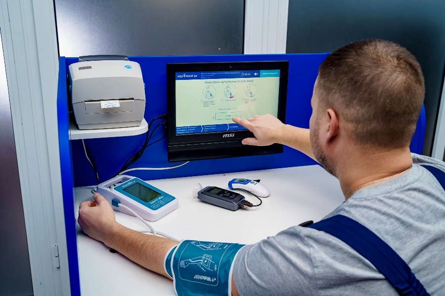 Следуя четким голосовым и текстовым подсказкам на экране, водитель самостоятельно измеряет давление, пульс, температуру и проходит тест на алкоголь (делает выдох в алкотестер). Все приборы работают автоматически, минимизируя человеческий фактор.