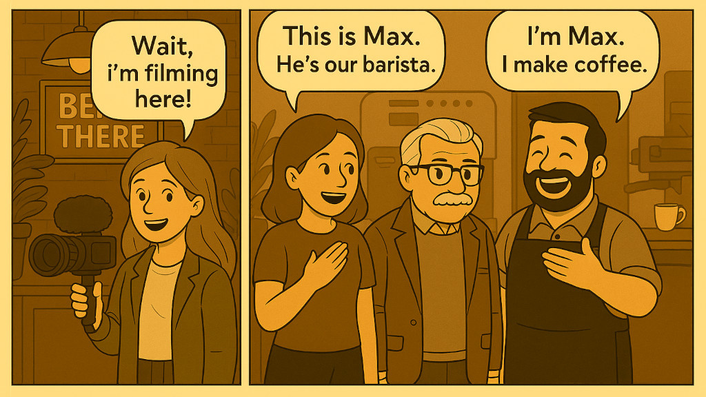 Мы в уютной кофейне Bean There. Лиза Коффи, видеоблогер и любительница каламбуров, продолжает снимать ролик для своего канала после возгласа «Wait, I’m filming here!» («Эй, я тут снимаю!») из первого урока. Она решает сделать ролик интерактивным и просит Эмму, мистера Брауна и баристу Макса представить друг друга для её зрителей, рассказав их имена и профессии. Получается весело, с шутками и лёгким кофейным вайбом!