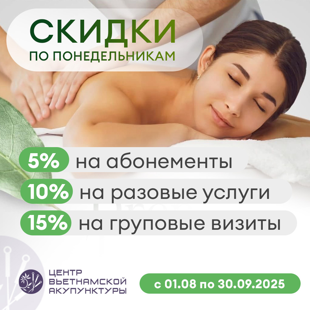 Спешим обрадовать изобилием скидок от медицинского центра вьетнамской акупунктуры «Вьетмед». ТОЛЬКО ПО ПОНЕДЕЛЬНИКА: Скидка -5% на разовые услуги; Скидка -10% на приобретение абонементских программ; Скидка -15% на групповые визиты от двух человек. Не упустите возможности, срок действия акции с 01.08.2025 по 30.09.2025. Узнать более подробную информацию и записаться на прием можно на сайте «Вьетмед» www.vietmed.ru или по тел.: +7 (495) 357-26-68 +7 (999) 397-37-07 +7 (926) 007-03-10 Где: ТЦ «Ханой-Москва», 2-й этаж. Медицинский центр «Вьетмед». Есть противопоказания. Необходима консультация специалиста. *Информационный пост, не является рекламой