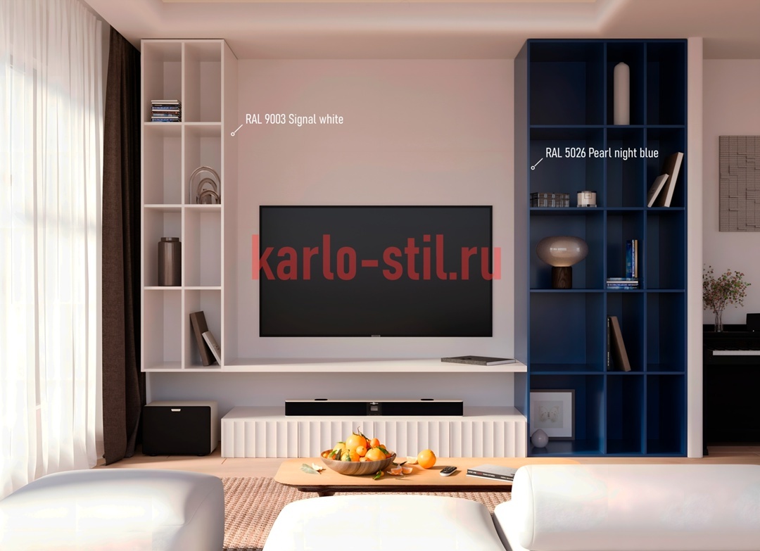 Представляем вашему вниманию стильную и функциональную ТВ-зону с фрезерованными фасадами из МДФ в матовой эмали, выполненную в эффектных цветах RAL 5026 Pearl Night Blue и RAL 9003 Signal White. Эта ТВ-зона станет не только изысканным акцентом вашего интерьера, но и удобным пространством для отдыха и развлечений. Почему стоит выбрать нашу ТВ-зону? Создайте уникальную атмосферу для отдыха! ТВ-зона с фрезерованными фасадами из МДФ в матовой эмали в цветах RAL 5026 Pearl Night Blue и RAL 9003 Signal White — это идеальное решение для тех, кто ценит стиль, качество и функциональность. Превратите свою гостиную в уютное пространство, где можно наслаждаться фильмами, играть в игры и проводить время с близкими в комфортной атмосфере. Не упустите шанс сделать свою ТВ-зону уникальной и стильной! Заказывайте уже сегодня в индивидуальном цвете и создайте пространство, где комфорт и элегантность идут рука об руку!