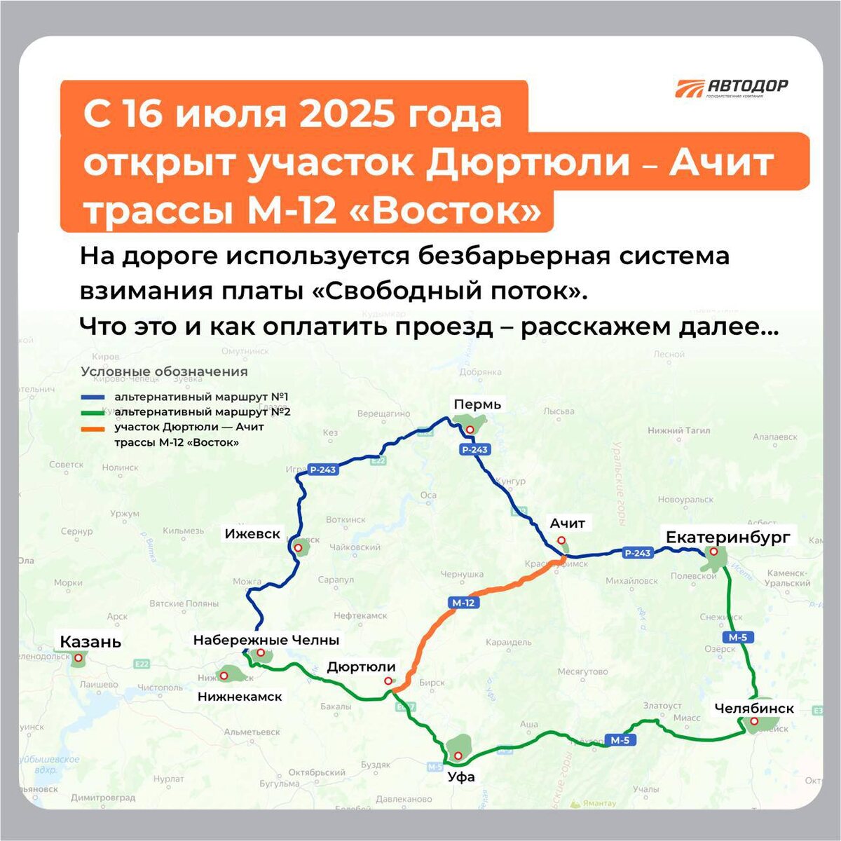 Для уральских автомобилистов оставили бесплатные пути объезда трассы М-12 «Восток».