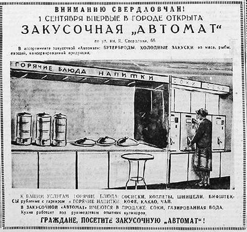 В Свердловске на улице Свердлова, 66 работали автоматы по продаже закусок. Это подтверждается газетной вырезкой с соответствующим объявлением. 1958 год.