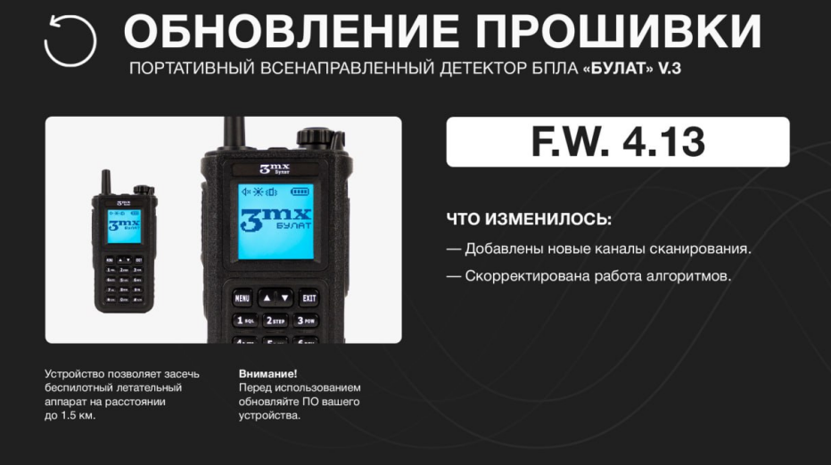 Вот что нового было включено в последние версии: Важно: непрерывные апдейты делают устройство более готовым к новым моделям дронов, включая FPV-самосборки, которые всё чаще используют злоумышленники. Перед началом убедитесь, что у вас есть: ⚠️ Перед обновлением рекомендуется временно снять антенну с устройства во избежание возможных помех для модуля связи. 📌 Шаги: ✅ Готово! После загрузки экрана «Поиск БПЛА» можно проверить прошивку в меню > Инфо: FW: 4.13. 📺 Полное видео по обновлению доступно здесь: