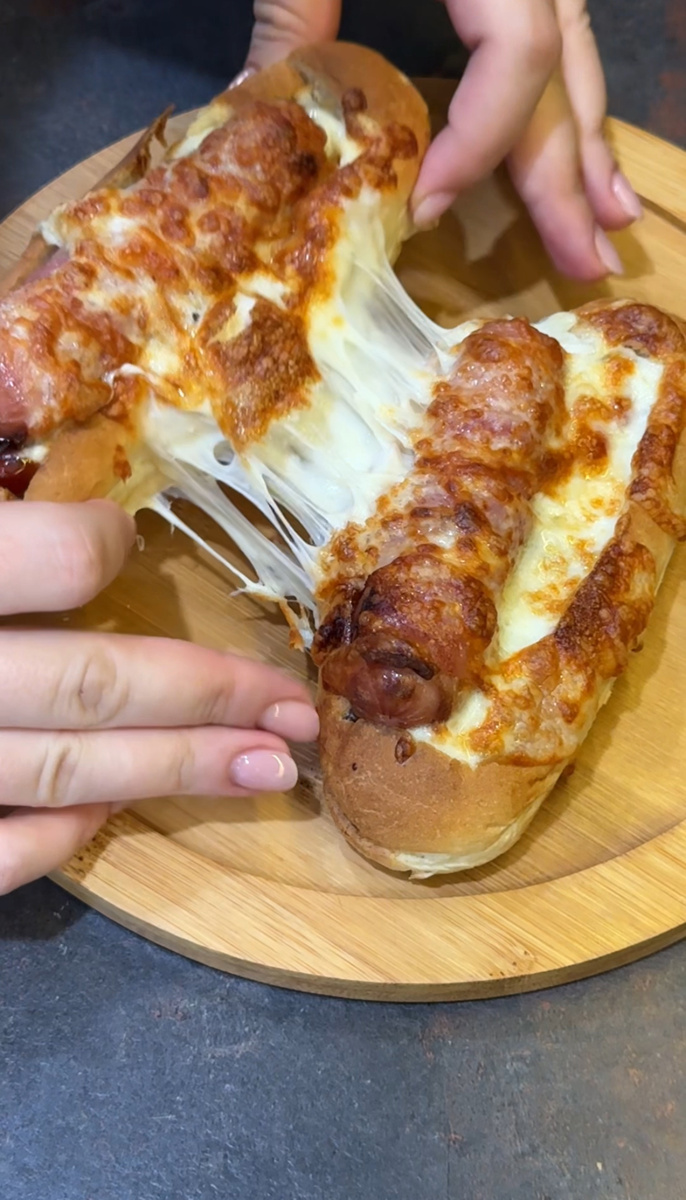 Нам понадобится: ~ Булочки для хот-догов 2 шт. ~ Сосиски 2 шт. ~ Бекон 2 ломтика ~ Сыр 60 гр. ~ Соус барбекю по вкусу Приготовление: Сосиски обматываем беконом и отправляем запекаться в аэрогриль или духовку (я отправила в аэрогриль при 200 градусах на 5 минут). В это время в булочках сверху вырезаем прямоугольник по размерам чуть больше сосиски. Придавливаем хорошенько пальцами центр. Кладем немного сыра, затем добавляем немного соуса барбекю, запеченную с беконом сосиску и сверху еще немного сыра. Отправляем снова запекаться. Я отправила в аэрогриль при 200 градусах еще на 5 минут. И вуаля! В своем ТГ канале делюсь праздничным сборником рецептов и конструктором по сборке 1000+ салатов на каждый день, а также своими полезными покупками на ВБ! Присоединяйся по ссылке 👇🏻