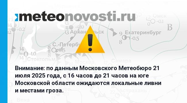 Внимание: по данным Московского Метеобюро 21 июля 2025 года, с 16 часов до 21 часов на юге Московской области ожидаются локальные ливни и