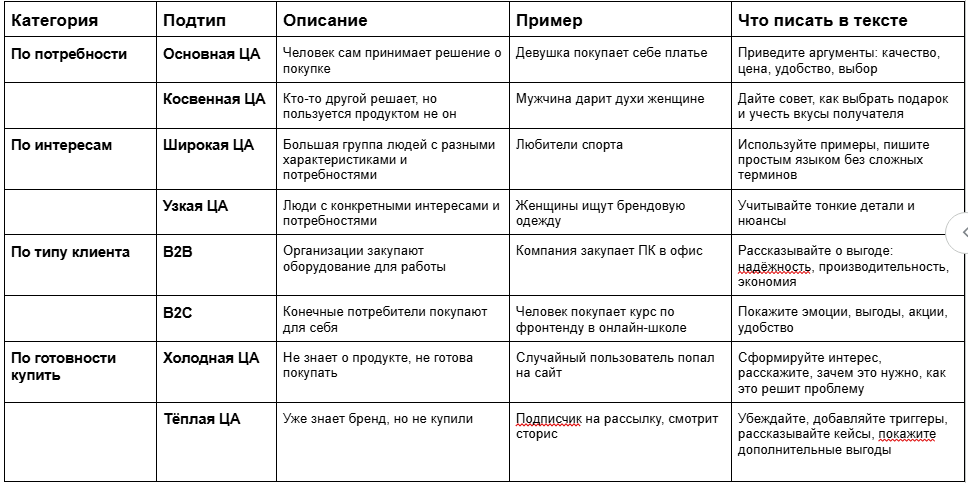 Целевая аудитория делится на типы: