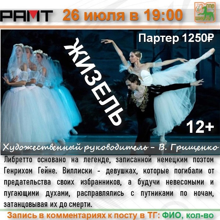 🩰 26 июля в 19-00 «ЖИЗЕЛЬ» Балет в 2-х действиях Русский классический театр балета Художественный руководитель - В. Грищенко на сцене РАМТ 💰Билеты в партере стоимостью от 3000₽ до 6000₽ по 1250₽! Орг сбор с билета 100₽ Либретто Теофиля Готье и Жюля-Анри де Сен-Жоржа Музыка Адольфа Адана Хореография Жана Коралли, Жюля Перро, Мариуса Петипа «Жизель» - вершина романтической хореографии, образец единства пантомимы и танца, который пережил свое время и остался навсегда в списке шедевров классического балета. 📝Запись в комментариях под этим постом. ☎Записались? Убедитесь, что заявка принята! Обязательно звоните председателю ППО. #Жизель #МойТеатральныйМарафон