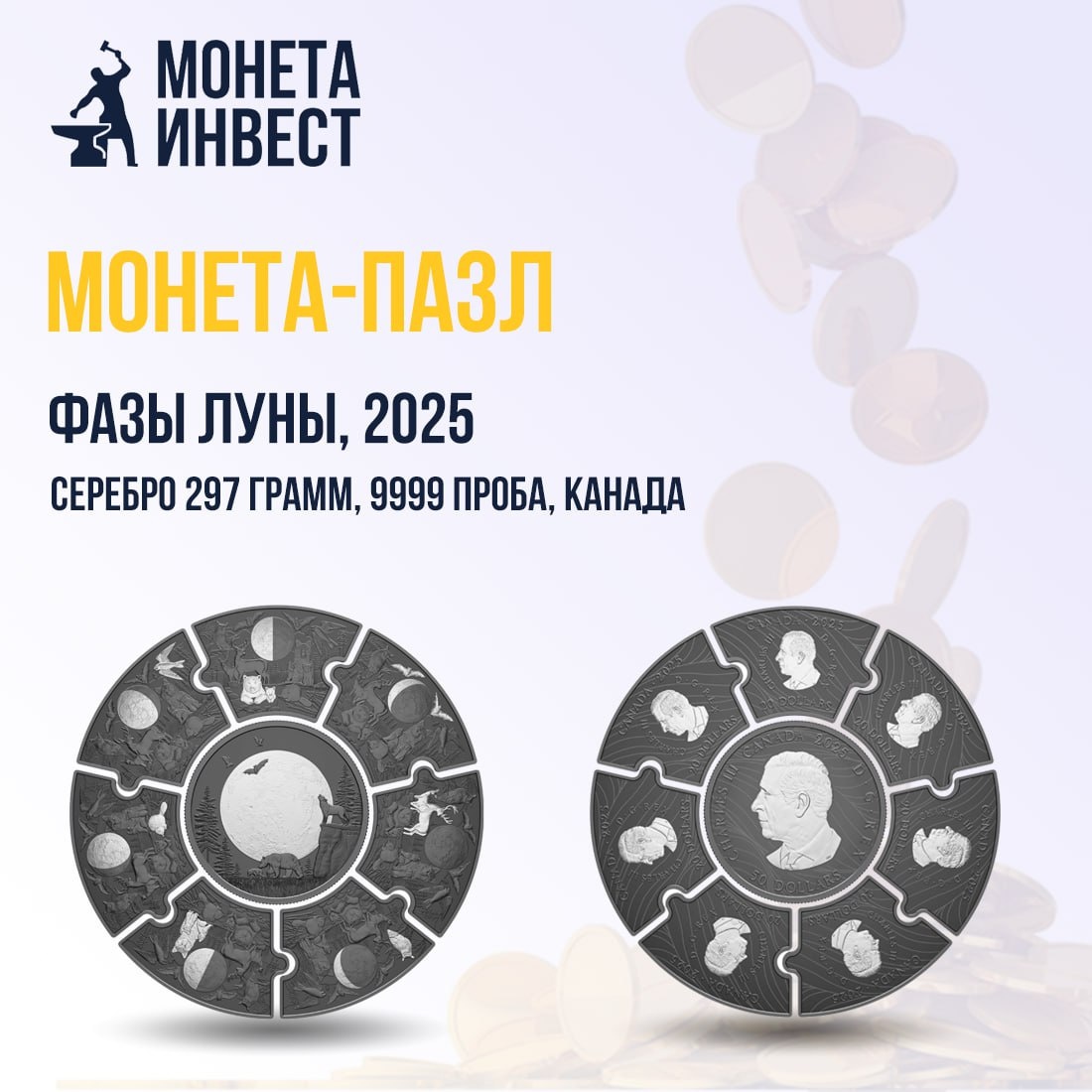 Королевский монетный двор Канады представил серебряную монету, посвященную фазам Луны. Изделие имеет форму круглого пазла, делящегося на 8 частей. Вокруг центральной части в форме круга с изображением полнолуния собирается 7 других частей, на каждой из которой изображена другая фаза луны. Помимо луны, на реверсе монеты также присутствуют лесные животные. На аверс монеты помещен портрет короля Великобритании Карла III. Монета изготовлена из серебра 9999 пробы массой 297 грамм