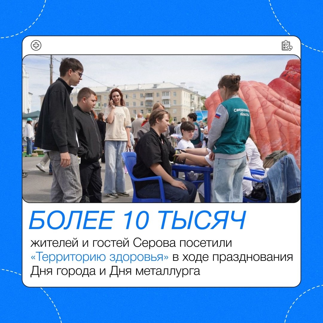 День Металлурга в Серове встретили с особым размахом! В минувшие выходные главная улица Серова вновь превратилась в пешеходный «Арбат» — большую праздничную площадку с интерактивными зонами. Одной из самых популярных стала локация о здоровом образе жизни, организованная медиками Серовской городской больницы при поддержке Областного центра общественного здоровья и медицинской профилактики. 📍 Что было на площадке? ✔️ Консультации по профилактике сердечно-сосудистых и онкологических заболеваний ✔️ Диагностические экспресс-тесты ✔️ Советы по ведению ЗОЖ от специалистов ✔️ Активное участие волонтёров Серовского филиала Свердловского областного медколледжа Первыми гостями «Территории здоровья» стали глава Серовского ГО Василий Сизиков и первый заместитель председателя ЗС СО Дмитрий Жуков. 📊 Серов — в лидерах по диспансеризации! По итогам первого полугодия 2025 года Серовский городской округ вошёл в тройку лидеров Северного округа по охвату диспансеризации и профосмотров. А по обследов