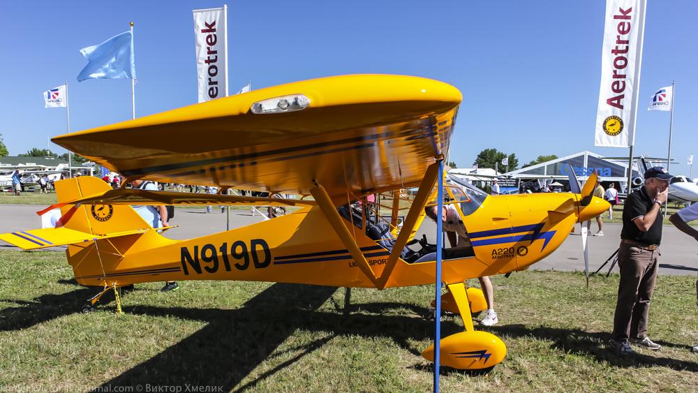 Экспозиция самолетов американской компании Aerotrek меня встретила практически у входа на летное поле. Интересный самолет, который оригинальным никак не назовешь, ведь концептуально это хорошо знакомый в авиационном сообществе еще с начала 80-х годов Kitfox! Более того, готовясь к публикации, я выяснил, что это совсем не американский самолет, а лёгкий двухместный Aeropro Eurofox словацкого производства! Компания Aeropro была образована в 1990 году и открыла свой завод в городе Нитра, Словакия. Поставки Eurofox начались в 1990 году. С 1999 года выпускались две версии: с хвостовой опорой и носовой. Характерной особенностью самолета являются складные крылья, за счет чего самолет может храниться либо в обычном гараже, либо в легком трейлере. Eurofox продаётся в Европе как в готовом виде, так и в виде набора для самостоятельной сборки. С 2009 года Eurofox начал продавались в США и Канаде компанией Aerotrek Aircraft из Блумфилда, штат Индиана. Эта компания назвала версию с носовым колесом