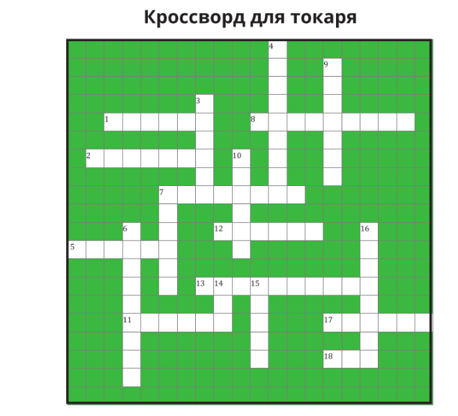 ПО ГОРИЗОНТАЛИ: 1. Оплачиваемая деятельность. 2. Короткий отдых, перерыв в работе. 5.Режущий вращающийся инструмент для получения отверстий. 7. Приспособления, предназначенные для установки и закрепления заготовок в требуемом положении относительно рабочих органов станка и режущих инструментов. 8. Работник склада. 11. Изделие, изготовленное без применения сборочных операций. 12. Изображение детали линиями на бумаге. 13.Нулевая точка станка по оси X Y и Z. 17.Приспособление для измерения детали. 18.Груда ненужного железа. ПО ВЕРТИКАЛИ: 3.Cпециальное устройство для крепления деталей или инструмента на оси шпинделя. 4.Руководящий цехом. 6.Специальное помещение, через которое люди идут на завод. 7.Сменные твердосплавные пластины с максимальным износом. 9. Человек, занятый трудом на заводе. 10.Управляющий участком. 14.Вдоль и поперек нее резец обрабатывает поверхность заготовки. 15.Настройки резанья глубины, подачи, частоты и скорости вращения шпинделя. 16.Внутреннее устройство токарного ст