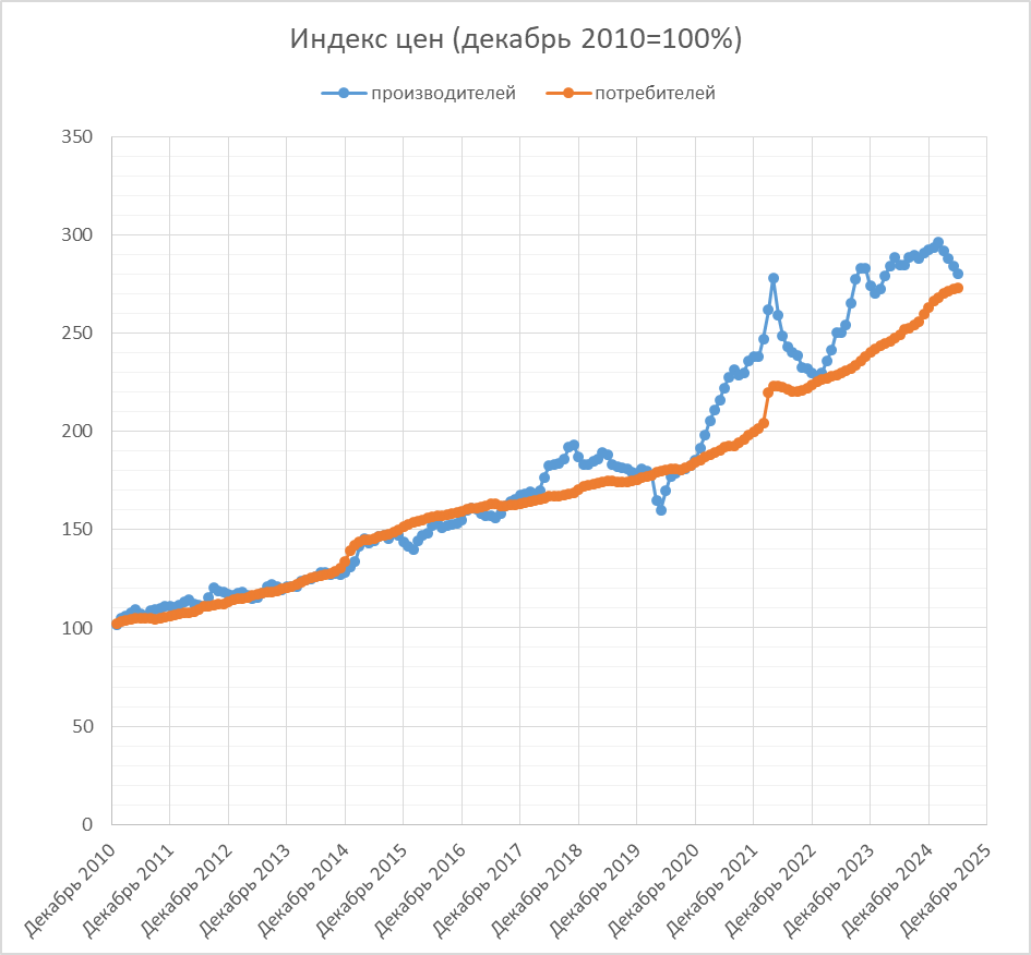 Давно не публиковал обзоров этого показателя, думаю, хотя бы по итогам полугодия надо это сделать. Вышли по нему свежие данные. В целом картина такая, достаточно интересная. Как видим, происходит сближение графиков, за счёт дефляции по ценам производителей - что согласуется с охлаждением в экономике. ИПЦ при этом тоже несколько снижается, но пока держится в районе 9-10. В последние недели, правда, мог повлиять ещё и рост тарифов и цен на бензин, посмотрим, что там будет потом, но пока замедление инфляции налицо. Если случится девальвация (которую многие вспоминают, как один из механизмов повышения рублёвых нефтегазовых доходов), то этот процесс может и развернуться, как мы видели раньше, в 2023-м. А может, и не будет девальвации, тогда интересно, что случится., будем следить. В разрезе отраслей картина такая. Локомотив снижения - нефтегаз (там и за 12 месяцев минус), но другие отрасли тоже потихоньку подтягиваются. Заранее извиняюсь, что не отвечаю оперативно на комментарии - много дел