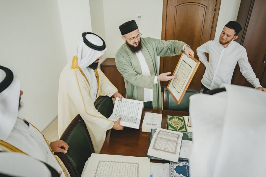 ☪🇷🇺🇶🇦ДУМ РТ посетила делегация Катара под руководством доктора Яхьи Науйми. Уважаемый гость приехал по приглашению на XX юбилейный Всероссийский форум мусульманской молодежи, который проводится муфтиятом ежегодно. 🔹Камиль хазрат рассказал гостям о деятельности нашего муфтията, жизни мусульман в республике и пр. 🌙Делегацию познакомили с проектом рукописного Куръана ДУМ РТ📖📚, провели экскурсию по зданию муфтията и медресе «Мухаммадия».